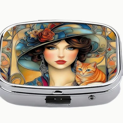 Pilleæske med kompakt design og kunstnerisk udsmykning på låget. Den har en guldfarvet finish og et indvendigt spejl. Æsken har to rum til opbevaring af små piller eller medicin og lukkes med et snaplås. Den er perfekt til daglig brug eller til rejser, hvor der er behov for at have medicin organiseret og sikkert opbevaret.