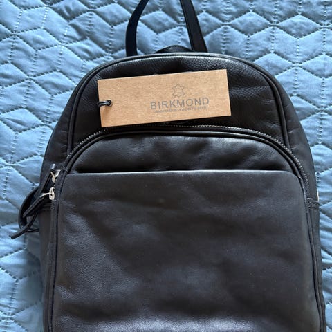 Rygsæk i brun læder med snørelukning og to frontlommer med metalspænder. Rygsækken har justerbare skulderstropper og en lille hanke foroven. Størrelsen er 24x24 cm.