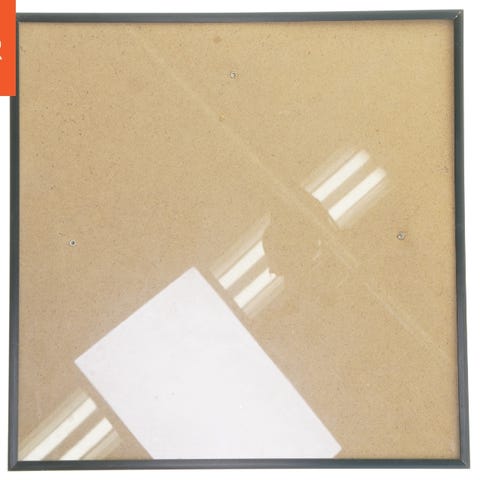 Den viste genstand er en kvadratisk billedramme med dimensionerne 32,5 x 32,5 cm. Rammen er lavet af sort metal og har en glasfront, der beskytter indholdet. Bagsiden af rammen består af en træplade med fire metalclips til fastgørelse af indholdet. Der er ingen synlige dekorationer eller billeder i rammen.