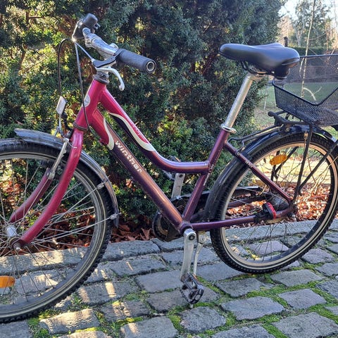 7 indvendige Shimano Nexus gear, håndbremse på forhjul, fodbremse på baghjul, bagagebærer, cykelkurv, to gode dæk, støttefod, baglygte og ringeklokke.