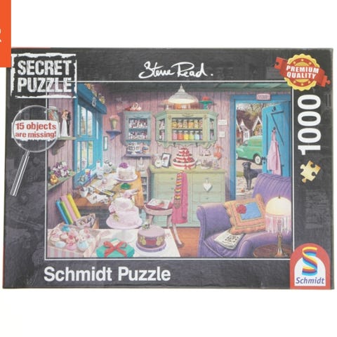 Dette er et puslespil fra mærket Schmidt med titlen 'June's Journey'. Puslespillet består af 1000 brikker, der samles for at afsløre et illustreret billede af en opholdsstue med rige detaljer og mange elementer. Produktet er af høj kvalitet og leveres i en robust kasse. Det er en del af serien 'Secret Puzzle', hvor man skal finde 15 manglende objekter i det færdige billede.