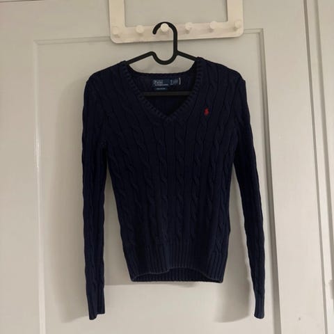 Polo Ralph Lauren sweater i blå farve, størrelse XS, lavet af bomuld. Med en klassisk kabelstrikket tekstur og V-hals.