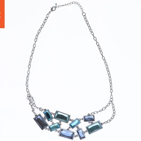 Dette er en halskæde, der består af små kvadratiske sten i en metalkæde. Stenene er indsat med jævne mellemrum rundt om kæden, hvilket giver den et unikt og stilfuldt udseende. Kæden er 38 cm lang og lukkes med en klassisk smykkelås, hvilket gør det nemt at tage den af og på. Halskæden er velegnet til både dagligdagsbrug og særlige lejligheder.