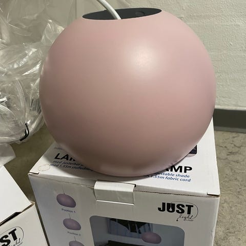 Med sort stofledning på ca. 2 m og pendelloftophæng i hvidmalet metal.