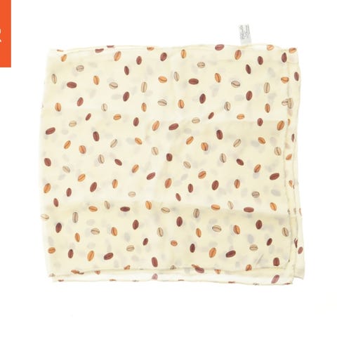 Silke tørklæde med målene 32 x 153 cm, som har et geometrisk mønster af ovaler og detaljer i lyse nuancer på en mørk baggrund. Stoffet ser ud til at være let og kan benyttes til forskellige dekorative formål eller som en del af beklædning.