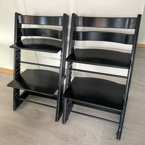 Stokke Trip Trap Højstol i sort farve. Fremstillet til børn med justerbar sidde- og fodstøtte for komfort og støtte. Materialet er robust og egnet til daglig brug.