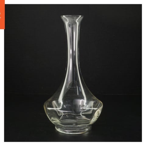 Dette er en glas karaffel, som måler 25 cm i højden. Karaflen har et unikt design med kurvede sider og en matchende rund glasprop, der passer perfekt til åbningen. Der er en etiket på forsiden af flasken. Propens kant viser tegn på slid.