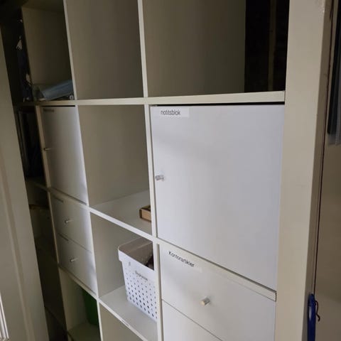 Der medfølger kasser i den lave reol og skabe i den kvadratiske reol.