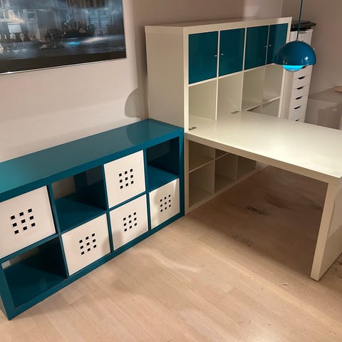 Søgeord: Rumdeler, kasser, kasse, turkis, hvid, skrivebord, hjemmekontor, kontor, hjemmearbejdsplads, arbejdsplads