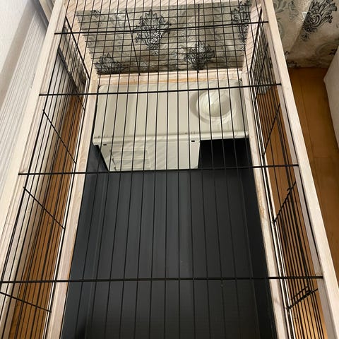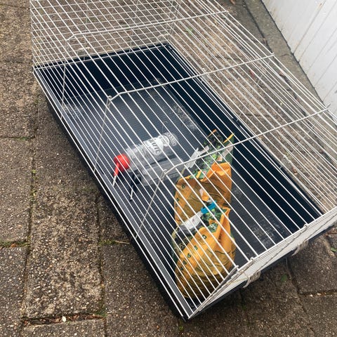 Bur til kanin eller marsvin. Længde 120 cm, bredde 58 cm og højde 60 cm. Transportkasse, kugle til hø, legetøj og sele medfølger.