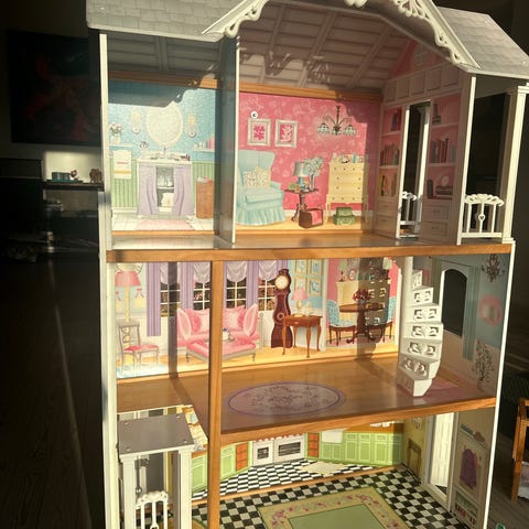 Dukkehus i træ med tre etager og flere værelser. Dukkehuset er malet lyserød og er påsat blomster og papirpynt, som evt kan trænge til en opfriskning. Indeholder møbler og små figurer, der kan placeres i husets forskellige rum. Alt på billedet medfølger.