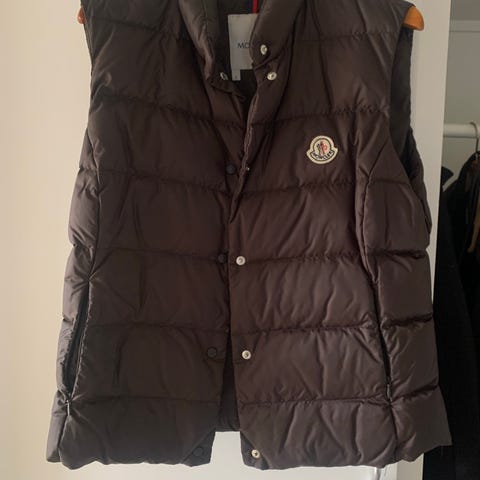 Moncler dunvest til kvinder i størrelse 4. Vesten er sort og lavet af dunmateriale, hvilket giver varme og isolering. Velegnet til udendørs brug som et let lag til at holde overkroppen varm.