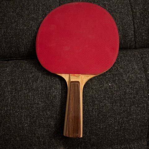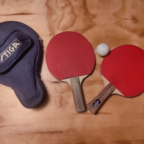 Stiga bordtennisbat med rød og sort gummi, træskaft og medfølgende blåt etui. Egnet til bordtennisspil.