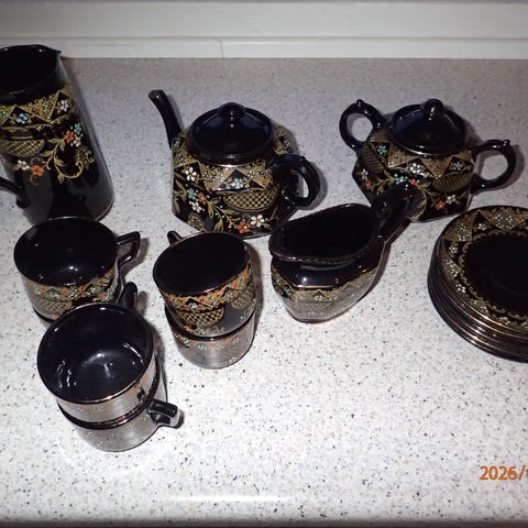 Dette stel har morfar vundet i æres præmie til Sønderborg ringridning i 1950'erne. Det består af 6 tekopper, 6 kage tallerkner, 6 underkopper og 1 sukker skål. Mærke ukendt. Sendes ikke.