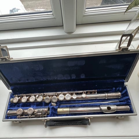 Flot tværfløjte i metal med en poleret overflade og flere knapper til tonejustering. Det leveres i et sort hårdt etui med grønt velour interiør. Tværfløjten har lukkede klapper, hvilket er typisk for begyndermodeller.