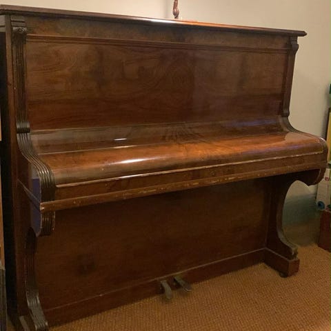 Zwicki upright piano (pianette) with a classic wood finish. Compact model with a smaller keyboard range than a full-sized piano, making it suitable for smaller rooms or apartments. Equipped with two pedals and produces a warm, traditional acoustic sound. The wood shows some surface marks from items having been placed on top over the years, consistent with age and normal use. In working condition but in need of tuning. Approximate dimensions: 130 × 95 × 55 cm. Buyer is responsible for transport (has to be moved from 2nd floor)