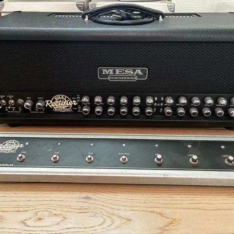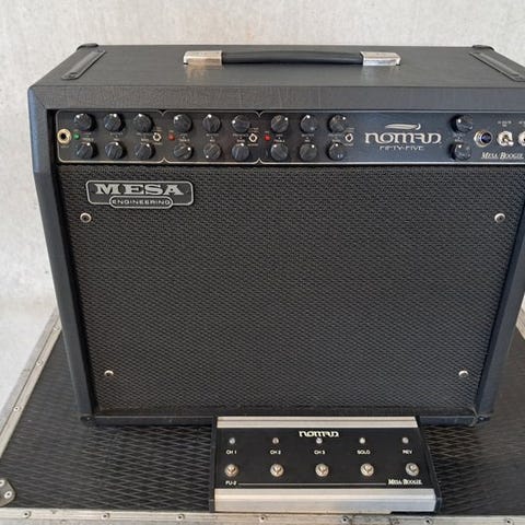Mesa Boogie F-50 50 watt combo guitarforstærker med 12 tommer højtaler og tilhørende fodkontakt og beskyttelsesbetræk.