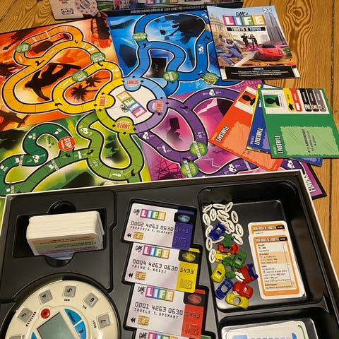 Hasbro The Game of Life brætspil med drejeskive, spillebrikker, spillekort og spilleplade. Spillet indeholder elementer som familie, overraskeelser, eventyr og rigdom, og er designet til at simulere livets forskellige valg og udfordringer.