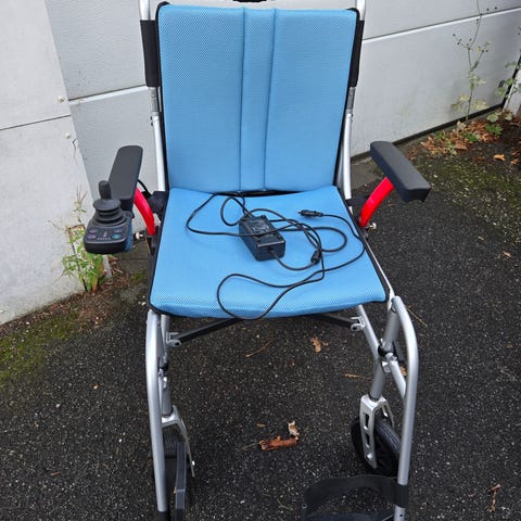 El kørestol til ude og inde brug. Er designet med fin rygstøtte, sikkerhedssele, fodstøtte, armlæn, ekstra støttehjul bagpå og OK affjedring. Joystik med flere hastigheder for inde og udendørsbrug.