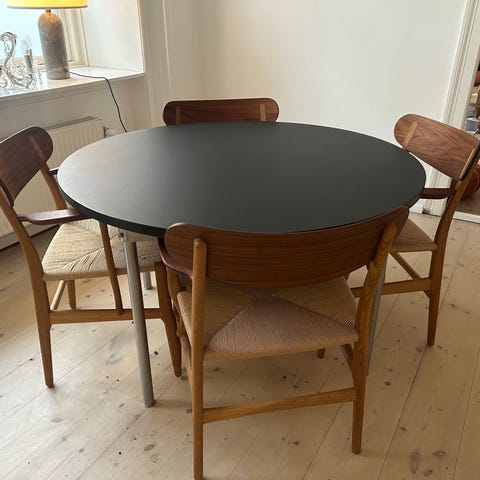 Sjældent rundt retro/vintage spisebord i massiv eg designet af Hans J Wegner og produceret af Ry Møbler fra 1970’erne. Det er behandlet og plejet i sæbe.