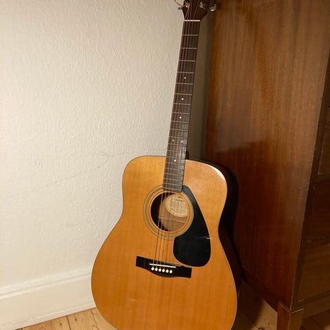 Yamaha F310 akustisk guitar med naturfarvet træfinish. Guitarens krop og hals er lavet af træmaterialer, og den har 6 strenge. Den er ikke brugt særlig meget, men har stået opbevaret og er derfor en smule støvet.