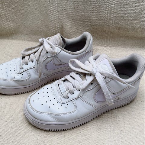 Nike unisex Air Force 1 i størrelse 38,5 Skoene er hvide og lavet i lædermateriale. En del brugsspor men kan sagtens klare 1/2 helt års mere brug, derfor ekstra billige