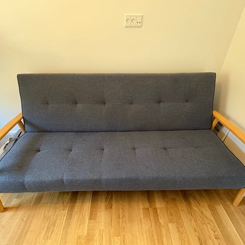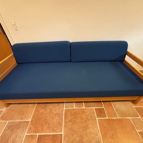 3 prs. blå sofa med chaiselong. Kan meget nemt trækkes ud til en sovesofa. Evt. til drenge/teenageværelset eller som hurtig gæsteseng eller lejlighed.