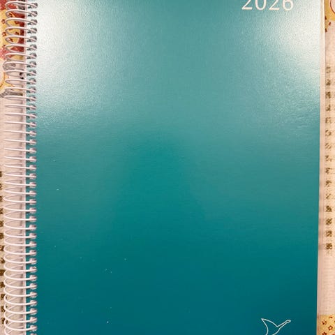 Familiens Ugeplanner 2026 kalender i A4-format med ugeplan, madplan og indkøbsliste. Kalenderen har et mønster på omslaget og indeholder plads til familierelaterede planer og noter.