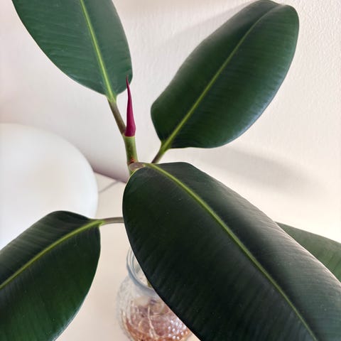 Indendørs plante med grønne blade i en hvid potte. Planten har flere grene med ovale, mørkegrønne blade. Velegnet til bolig- eller kontorindretning.