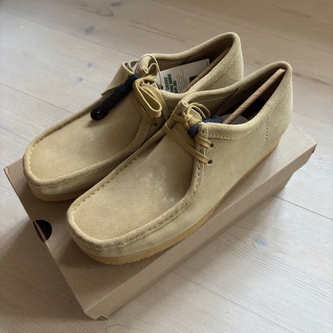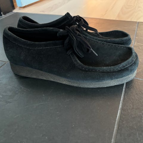Clarks Orginals Wallabee sko i størrelse 39,5 Skoene er sorte og lavet af ruskindsmateriale. Velegnede til daglig brug. Velholdt men med brugsspor
