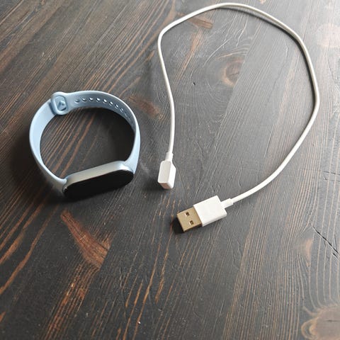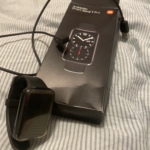 Xiaomi Smart Band 7 Pro smartwatch armbånd med sort rem. Enheden har en rektangulær skærm, der viser pulsmåling og andre sundhedsdata. Produktet leveres med original emballage, brugermanual og opladerkabel.