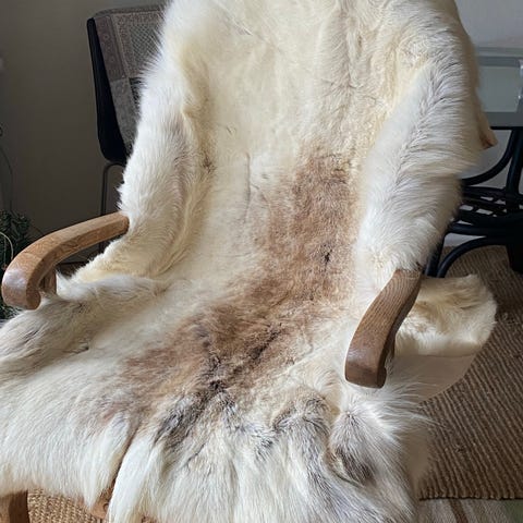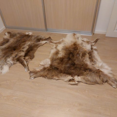 Pænt fra dyre- og røgfrit hjem. Skindet fælder. Ved ikke om det fælder mere end rensdyrskind generelt gør. Kan sendes.