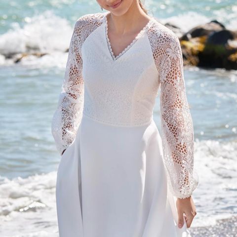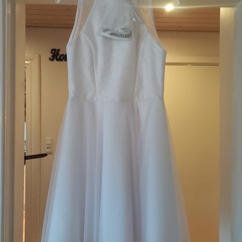 Brugt en gang, men der er desværre kommet sovseplet foran på kjolen.