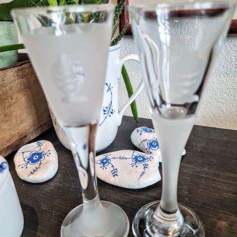 2 snapseglas, med indgraveret motiv, fra Pernille Bülow glas