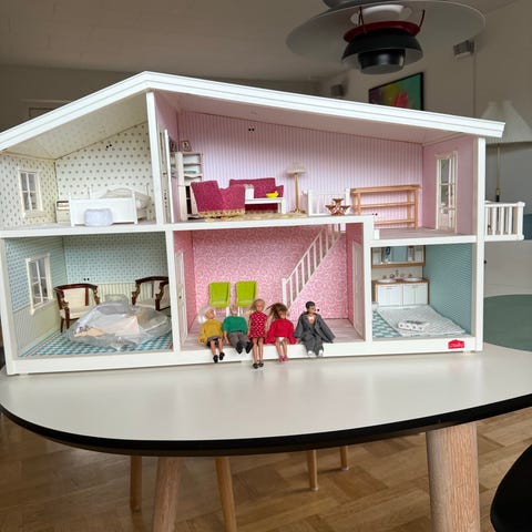 Dukkehus med flere etager og detaljerede værelser. Indeholder møbler såsom seng med sengehimmel, toilet og diverse indretningselementer. Har små skrammer hist og pist men meget fint 😊