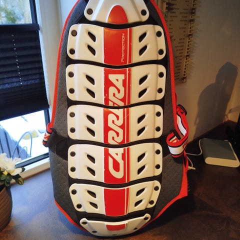 Sikkerhed: CE-godkendt rygskjold med leddelte plastplader, der giver god bevægelsesfrihed.