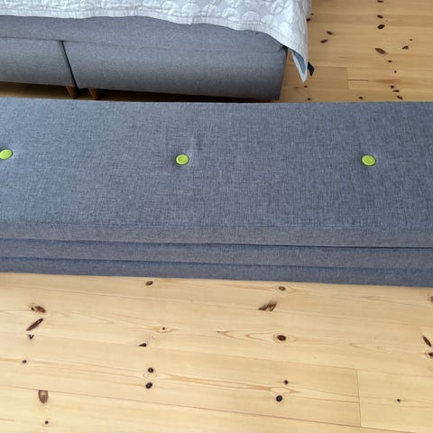 Foldet ud som en gæstemadras/tumlegulv: H: 12 cm B: 120 cm L: 210 cm