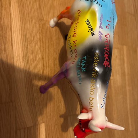 Rød Cow Parade kofigur på hjul med nummer 7