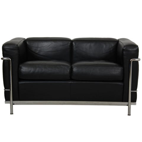 Le Corbusier LC2 sofa i sort læder med polstret sæde og ryg. Sofaen har en karakteristisk metalramme og er designet til at give komfort og stil i moderne indretning. kr. 30.000 for 3 personers og kr. 22.000 for 2 personers