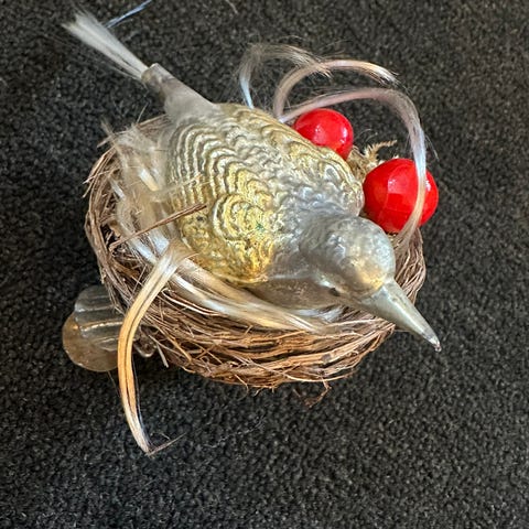 Stork monteret på clips med rede af tinsel. Den vogter sit æg. Ca. 12 cm. God brugt stand. Lidt farvetab på næb.