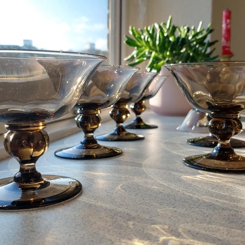 De smukkeste gamle champagneskåle / cocktail glas med champagnefarvet knopstilk. 7 stk haves. De hedder Gulli, designet af Siegfrid Ståhl og lavet på det svenske glasværk Skruf. Flot stand og utrolig sjældne at støde på. Et par har et mikro mikro nøk på kanten. Samlerobjekt.