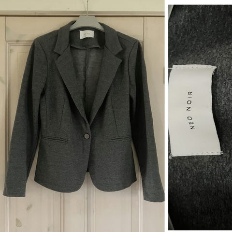Neo Noir blazer i størrelse M til kvinder. Fremstillet i bomuld med grå farve. Jakken har en enkelt knaplukning og to sidelommer. Designet med klassisk revers og en tætsiddende pasform.