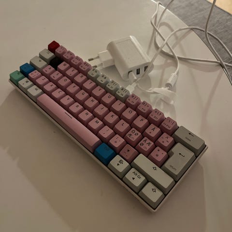 Tastatur Tastaturer og mus med farvede taster i blå, gul, rød og grøn. Sort base og kompakt design.