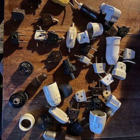 En række el-installationskomponenter i hvid farve. Sættet indeholder forskellige rammer, afbrydere, stikkontakter og dæksler til elinstallation. Komponenterne er brugte men i fin stand og mindre farve nuancer kan forekomme. LK-fuga