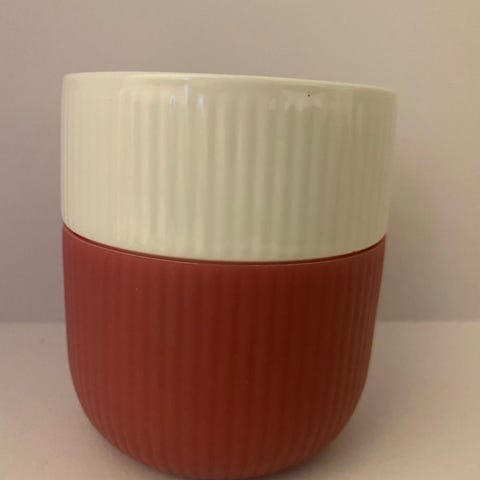 Kopperne har en hvid overdel og en rød silikonebund, der giver et godt greb. Materialet er porcelæn med silikone.