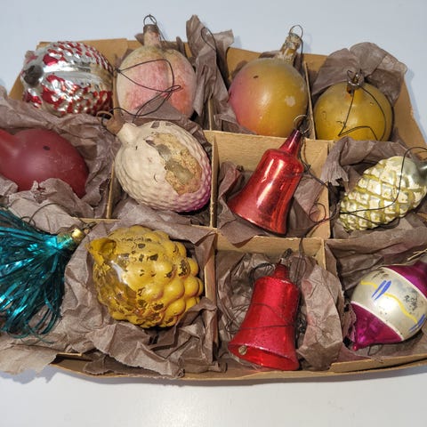 Antik julepynt - vindrueklase med små cherise farvede glasbær og et vindrueblad i papir. Ornamentet måler ca. 11 cm med stængel.
