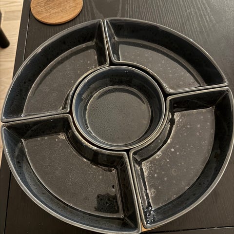To-etagers serveringsfad i grøn plast med håndtag til nem transport. Fadet har to runde niveauer til opbevaring eller præsentation af mad eller småting.