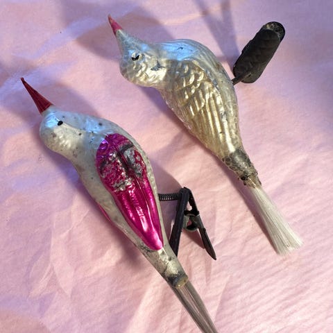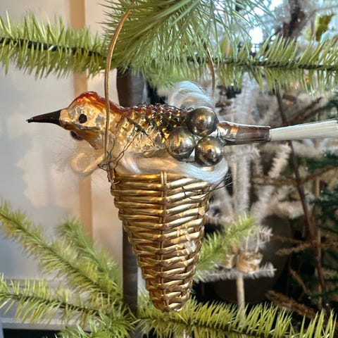 Antik fugl monteret i rede på clips. Reden er foret med englehår og to røde bær. Ca. 5 cm høj