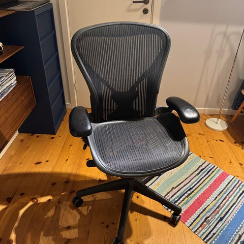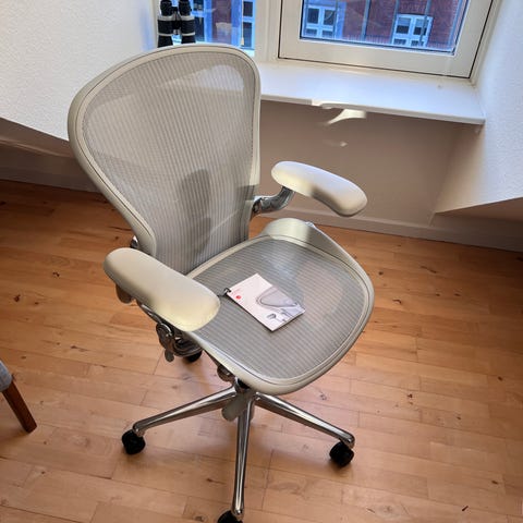 Flere detaljer og konfiguration kan ses her https://interstudio.dk/vare/aeron-chair-mineral-mineral/ (stolen er Model B).