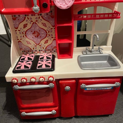 Legetøjssæt bestående af diverse køkkenredskaber, madvarer, drikkevarer, service og tilbehør i forskellige farver og materialer. Sættet indeholder blandt andet gryder, pander, knive, gafler, skeer, glas, flasker, madvarer som brød, grøntsager, kager, samt små tasker og diverse køkkenudstyr. Velegnet til rolleleg og læring om madlavning og køkkenaktiviteter.